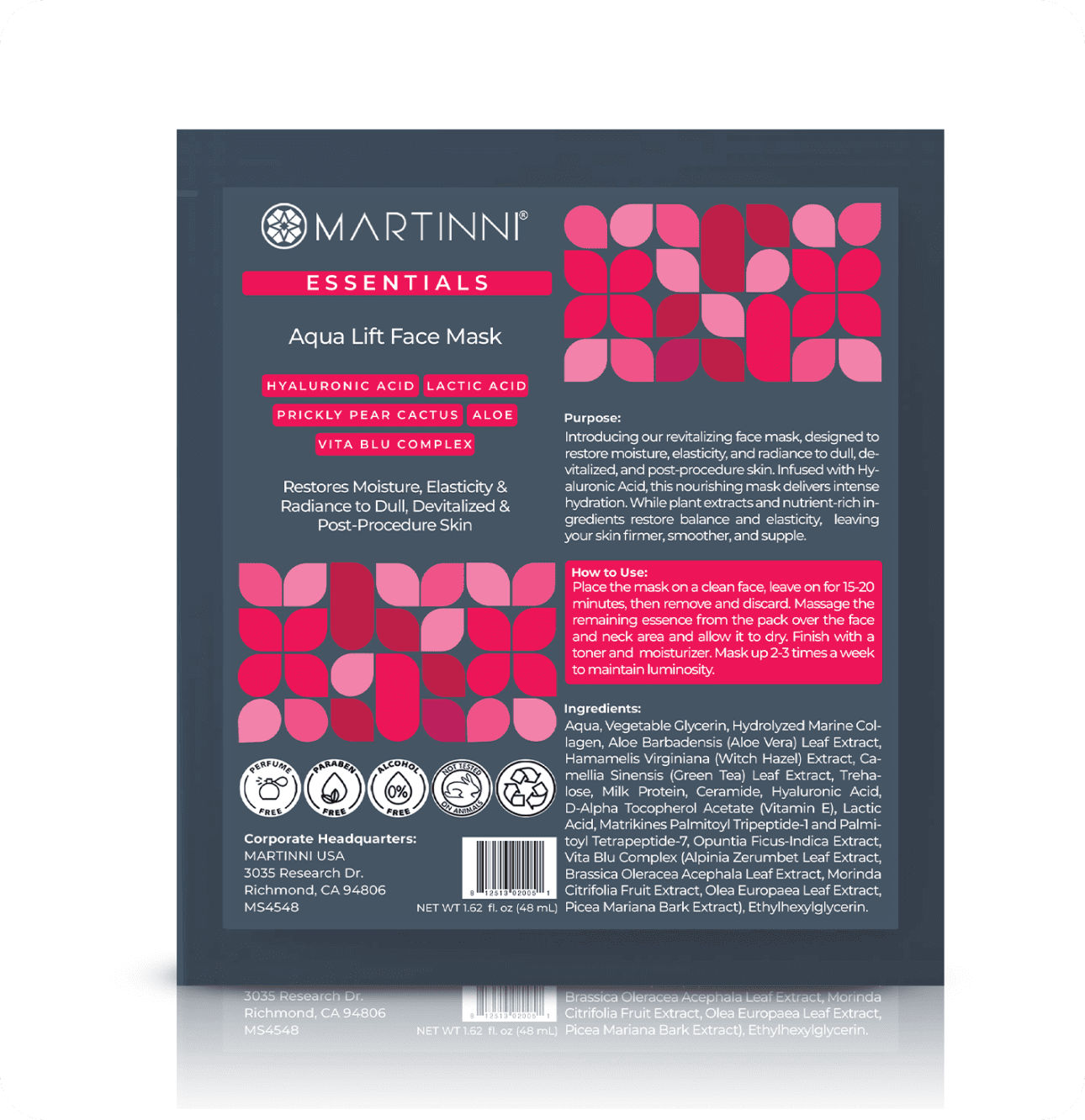 Revitalize your skin with Martinni Beauty’s Aqua Lift Face Mask. Infused with Hyaluronic Acid, Lactic Acid and Prickly Pear Cactus, this nourishing mask is formulated to give intense hydration, restore moisture, elasticity and radiance to dull, devitalized, and post-procedure skin. While plant extracts and nutrient-rich ingredients restore balance and elasticity, leaving your skin firmer, smoother, and supple.