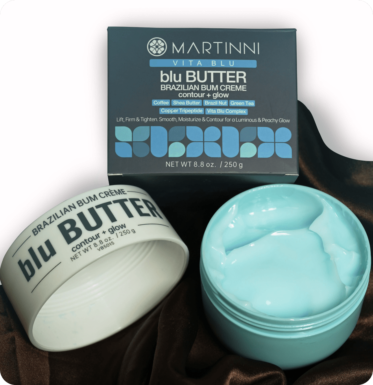 Revitalize your skin with Martinni Beauty’s Blu Butter Brazilian Bum Crème. This luxurious formula smooths, moisturizes, and contours for a luminous and peachy glow. This contouring butter-creme targets cellulite and hydrates, firms and lifts the skin. Potent antioxidant-rich plant extracts smooth and tightens the appearance of crepey and sagging skin to refine and redefine the structural contours. Luxurious Brazil Nut Oil combined with Shea Butter and Vita Blu Complex leaves a younger, firmer bouncy glow.