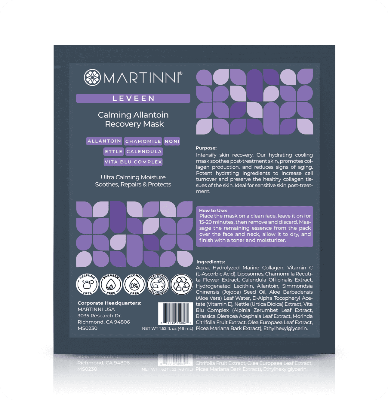 Experience the ultimate post-treatment care with Martinni Beauty’s Calming Allantoin Relief Mask. Infused with Allantoin, Chamomile and Calendula, this hydrating cooling mask soothes sensitive skin, promotes collagen production, reduces signs of aging and accelerates skin recovery. Perfect for calming redness and irritation while deeply moisturizing and rejuvenating the skin. Ideal for sensitive skin post-treatment.
