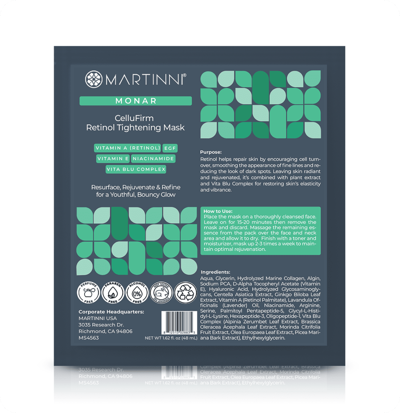 Reveal radiant, youthful skin with Martinni Beauty’s CelluFirm Retinol Tightening Mask. Enriched with Retinol, Niacinamide, Vitamin E and Vita Blu Complex, this rejuvenating mask promotes cell renewal, smooths fine lines and diminishes dark spots, leaving skin radiant and rejuvenated.