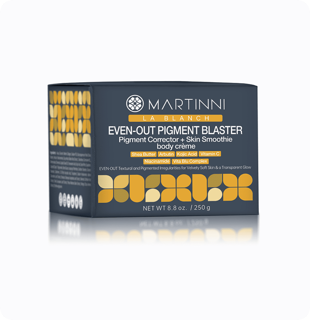 Achieve radiant skin with our Even-Out Pigment Blaster Skin Smoothie Body Crème. This rich crème targets pigmentation and texture irregularities for a smooth, luminous finish. The plant extracts help to remove dead skin cells and gives a lighter and clarified appearance. Multi-active skin lightening agents help correct unwanted brown spots, melasma, sun damage, skin darkening and discoloration as Hyaluronic Acid and Shea Butter soften and eliminate rough patches. Safe for face & body: knee, elbow, intimate nipple, inner thigh & underarm.