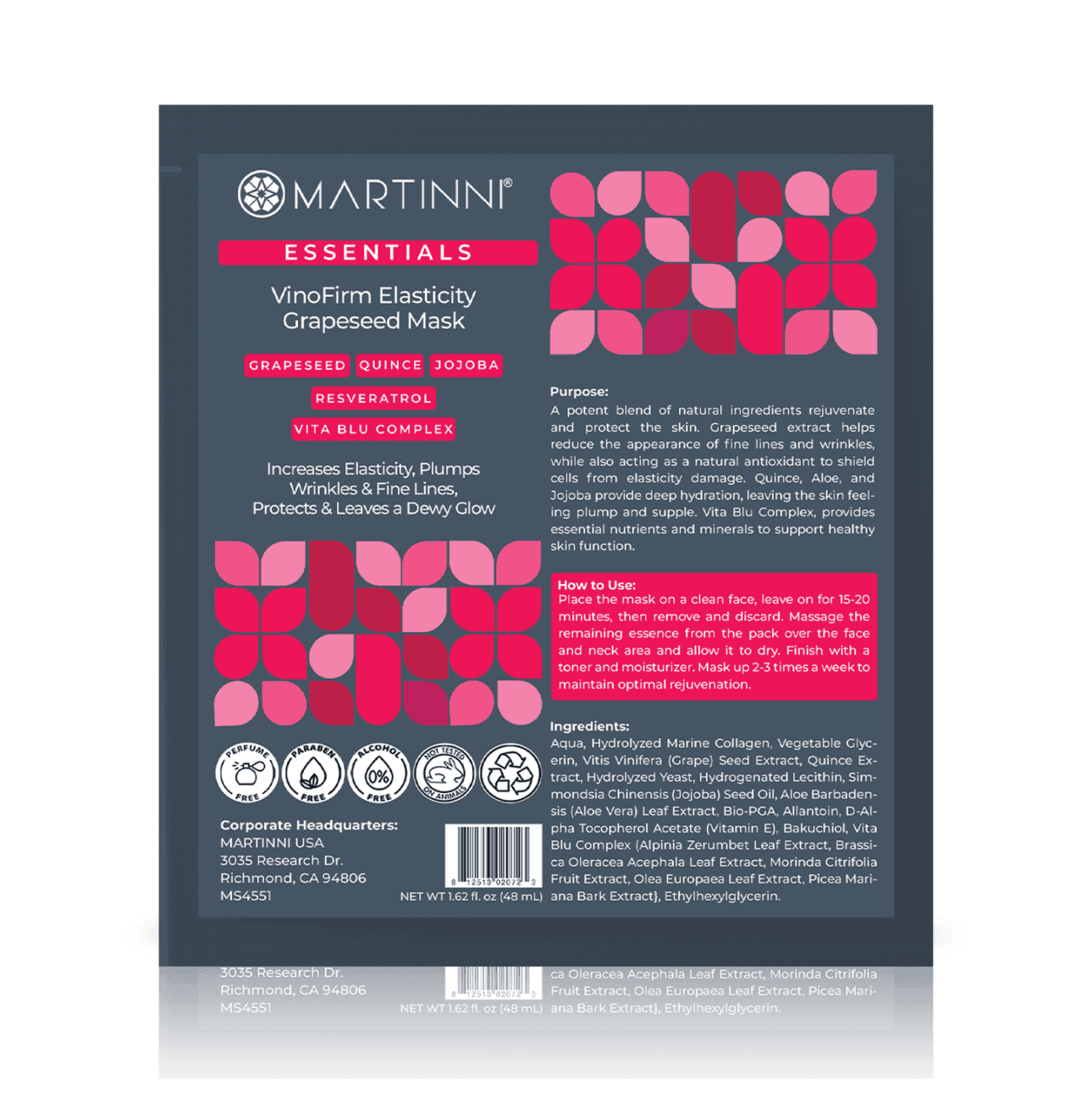 The VinoFirm Elasticity Grapeseed Mask is a potent blend of natural ingredients that rejuvenate and protect the skin. Grapeseed extract helps reduce the appearance of fine lines and wrinkles, while also acting as a natural antioxidant to shield cells from elasticity damage. Quince, Aloe and Jojoba provide deep hydration, leaving the skin feeling plump and supple. Vita Blu Complex, provides essential nutrients and minerals to support healthy skin function.